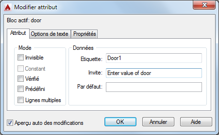 Active ou désactive la vérification des valeurs. Si cette option est sélectionnée, vous êtes invité à vérifier les valeurs associées à l'attribut lors de l'insertion d'une nouvelle occurrence du bloc. Dans le cas contraire, la vérification ne se fait pas.