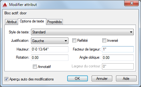 Définit les propriétés qui déterminent l'aspect du texte d'un attribut dans le dessin. Pour modifier la couleur du texte de l'attribut, utilisez l'onglet Propriétés.