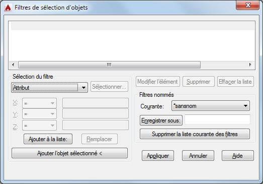 Ajoute un objet sélectionné dans le dessin à la liste des filtres.
