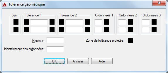 Affiche le symbole géométrique caractéristique sélectionné dans la boîte de dialogue Symbole. Celle-ci s'affiche pour vous permettre de sélectionner l'une des boîtes de texte Sym.