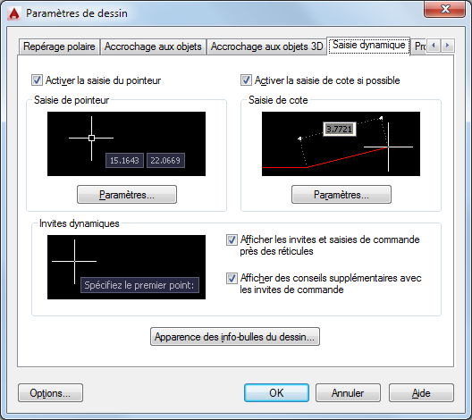 Gère la saisie du pointeur, la saisie de cote, les invites dynamiques et l'apparence des info-bulles de dessin.