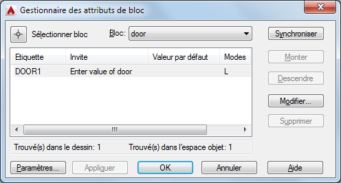 Les attributs du bloc sélectionné sont affichés dans la liste des attributs. Par défaut, les propriétés d'attribut Etiquette, Invite, Par défaut, Modes et Annotative sont affichées dans la liste des attributs. Une description apparaissant sous la liste des attributs indique pour chaque bloc sélectionné le nombre d'occurrences dans le dessin et le calque actifs.