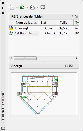 Dans la palette Références externes, vous pouvez afficher les informations relatives au calque sous-jacent sous forme d'une liste ou d'une arborescence. Pour déterminer le mode d'affichage des informations dans la palette Références externes, cliquez sur le bouton Affichage sous forme de liste ou Affichage sous la forme d'une arborescence, dans le coin supérieur droit du gestionnaire. La liste présente le nom de chaque calque sous-jacent du dessin, accompagné de son état de chargement, de sa taille, de la date de sa dernière modification et de son chemin d'accès. L'arborescence, quant à elle, fournit un affichage hiérarchique des calques sous-jacents qui montre leur niveau d'imbrication au sein des références externes et des blocs. Elle n'indique pas l'état, la taille ni aucune autre information sur les images.