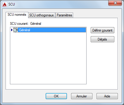 Affiche les SCU définis dans le dessin courant. Un pointeur indique le SCU courant.