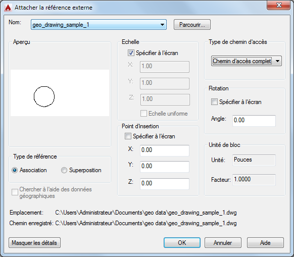 Sélectionnez le chemin d'accès complet (absolu), le chemin d'accès relatif ou aucun chemin d'accès à la référence externe mais le nom de la référence externe (le fichier doit figurer dans le dossier contenant le fichier de dessin courant).