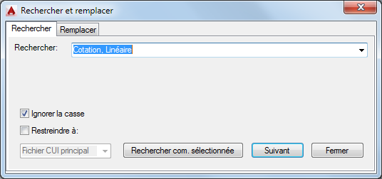 Limite la recherche au fichier CUIx sélectionné dans la liste déroulante. Par défaut, le fichier CUIx principal ( acad.cuix pour AutoCAD ou acadlt.cuix pour AutoCAD LT) est recherché.