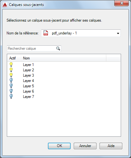 Utilisez la commande CALQUESDWF, CALQUESPDF, CALQDGN ou CALQUESJ, ou cliquez avec le bouton droit de la souris sur un calque sous-jacent sélectionné et choisissez Calques dans le menu contextuel.