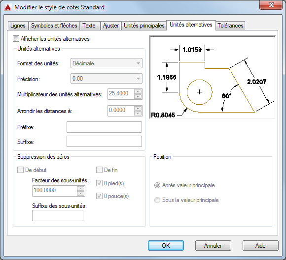 Spécifie l'affichage d'unités alternatives dans les mesures de cote, et définit leur format et leur précision.