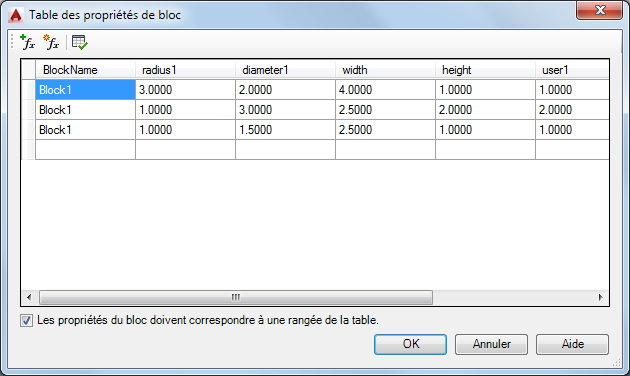 Dans la boîte de dialogue Table des propriétés de bloc, les en-têtes de colonne sont des paramètres et les lignes définissent les valeurs du jeu de propriétés. Une référence de bloc sélectionnée peut être définie sur les valeurs définies. Chaque définition de bloc peut posséder une table.