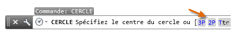 Vous pouvez également entrer CERCLE ou uniquement C dans la fenêtre de commande, puis cliquer pour choisir une option. Dans ce cas, vous avez la possibilité de spécifier un centre ou de cliquer sur l'une des options de commande mises en surbrillance, comme indiqué ci-dessous.
