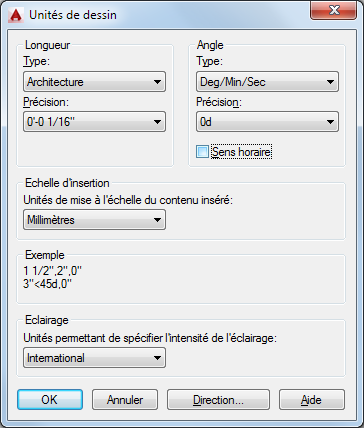 Les valeurs possibles sont Architecture, Décimal, Ingénierie, Fractionnaire et Scientifique. Les formats Ingénierie et Architecture génèrent des affichages en pieds et en pouces et supposent que chaque unité de dessin représente un pouce. Les autres formats peuvent représenter une unité réelle quelconque.