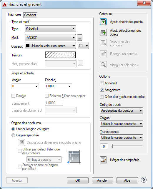 La boîte de dialogue Hachures et gradient comporte deux onglets et des options communes qui sont disponibles dans les deux onglets.