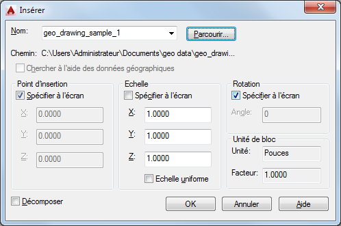 Permet d'indiquer le nom du bloc ou du dessin à insérer, ainsi que son emplacement.