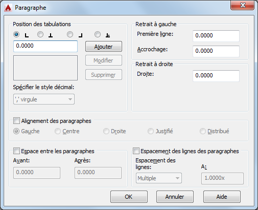 Définit le style décimal selon le paramètre régional courant de l'utilisateur. Les styles décimaux disponibles sont le point, la virgule et l'espace. Ce paramètre est conservé avec le dessin même si le paramètre régional est modifié.