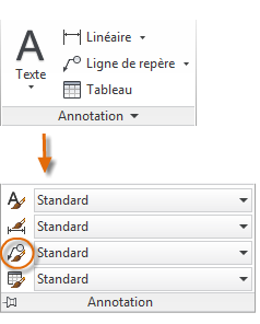 Tout comme d'autres fonctions d'annotation, le texte multiligne fournit un grand nombre de paramètres. Lorsque vous enregistrez ces paramètres en tant que style de texte à l'aide de la commande STYLE, vous pouvez accéder aux styles de texte que vous avez enregistrés en cliquant sur la flèche déroulante située dans le groupe de fonctions Annotation. Le style de texte courant s'affiche en haut de la liste déroulante.