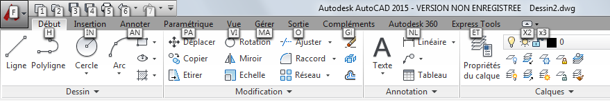 Vous pouvez utiliser des combinaisons de touches au lieu du dispositif de pointage pour effectuer des sélections dans les menus, la barre d'outils d'accès rapide et les rubans. Pour connaître les combinaisons de touches disponibles dans l'espace de travail courant, appuyez sur la touche Alt.