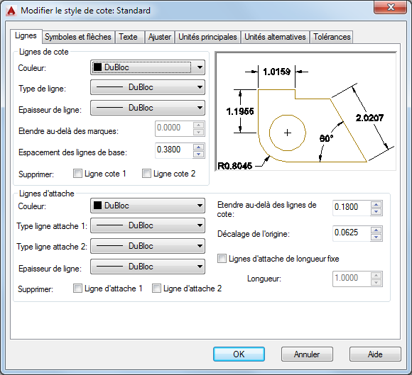 Les styles de cote permettent d'établir et d'appliquer des normes de dessin. De nombreuses variables de cote peuvent être définies à l'aide de la commande COTSTYLE pour contrôler presque chaque nuance de l'aspect et du comportement des cotes. Tous ces paramètres sont stockés dans chaque style de cote.