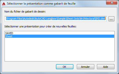 Indique le chemin de dossier, le fichier gabarit de dessin (DWT) et le nom de présentation à utiliser pour créer des feuilles.