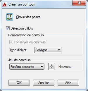 Définit le type d'objet, le jeu de contours et la méthode de détection d'îlots pour créer une région ou une polyligne à partir des objets qui englobent un point spécifié.
