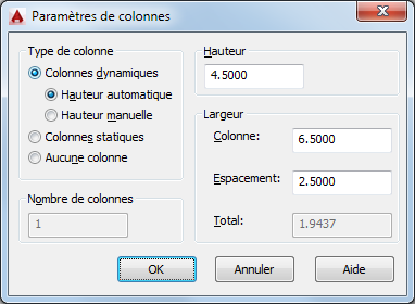 Affiche et spécifie les valeurs de largeur des colonnes de contrôle et de l'espacement. La valeur de l'espacement correspond à cinq fois la hauteur de texte par défaut.