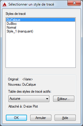 Affiche les styles de tracé disponibles, y compris le style par défaut NORMAL. Un style de tracé est un ensemble de paramètres de propriété utilisés au cours du tracé.