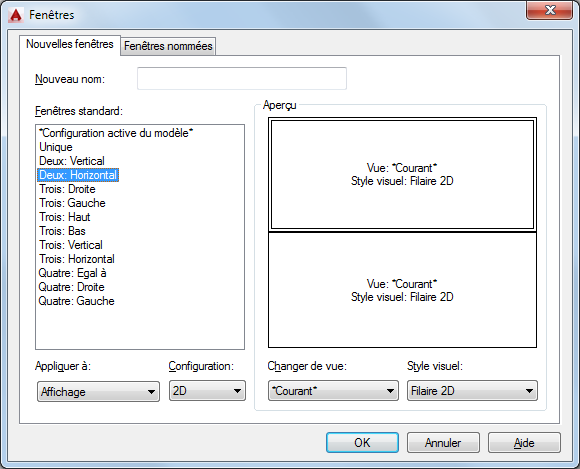 Indique une configuration 2D ou 3D. Si vous sélectionnez l'option 2D, le nouveau fenêtrage est initialement créé avec la vue courante dans toutes les fenêtres. Si vous sélectionnez l'option 3D, un ensemble de vues 3D orthogonales standard est appliqué aux fenêtres de la configuration.