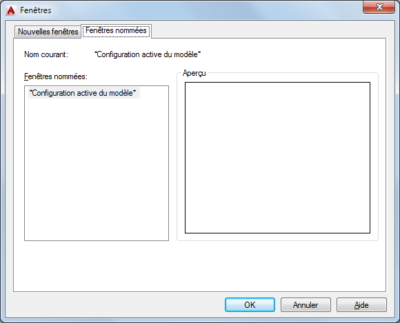 Affiche les configurations de fenêtres de l'espace objet enregistrées et nommées que vous pouvez utiliser dans la présentation courante. Vous ne pouvez ni enregistrer, ni nommer un fenêtrage de fenêtres de présentation.