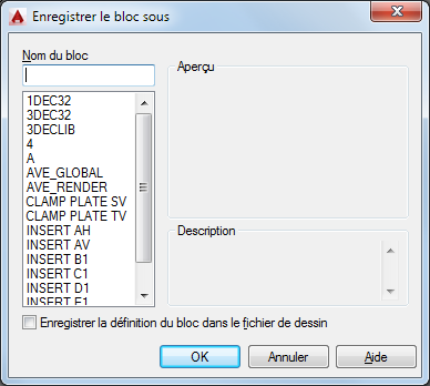 Enregistre la définition de bloc en tant que fichier de dessin. Si vous sélectionnez un fichier de dessin existant, le fichier enregistré est remplacé. Par défaut, le nom de bloc spécifié est considéré comme le nom du fichier de dessin.
