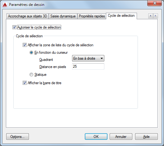 Le cycle de sélection permet de sélectionner des objets qui se chevauchent au moyen de la combinaison de touches Maj+Espace. Vous pouvez indiquer si une icône en forme de curseur bleu doit s'afficher pour indiquer les objets qui se chevauchent. Par ailleurs, vous avez la possibilité de configurer les paramètres d'affichage de la zone de liste Sélection.