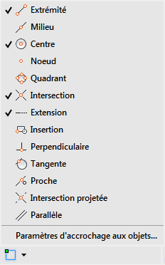 Dans la barre d'état, cliquez sur la flèche vers le bas du bouton Accrochage aux objets, puis choisissez Paramètres d'accrochage aux objets.