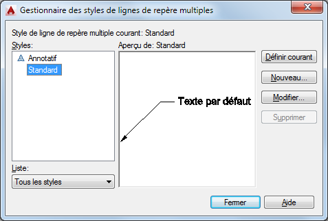 Supprime le style de ligne de repère multiple sélectionné dans la liste Styles. Vous ne pouvez pas supprimer le style en cours d'utilisation dans le dessin.
