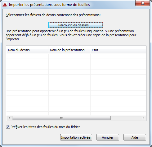 Si une présentation appartient déjà à un jeu de feuilles, vous devez créer une copie du dessin contenant la présentation en vue de l'importer.