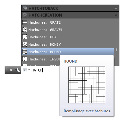 Exemple : vous souhaitez insérer un motif de hachures. Lorsque vous entrez hachures dans l'invite de commande et appuyez sur la touche de tabulation pour parcourir les options, la liste de suggestions de la ligne de commande se développe pour inclure les motifs de hachures disponibles. Faites glisser la barre de défilement pour afficher des hachures et des dégradés supplémentaires. Vous pouvez voir une miniature de chaque option en plaçant le curseur de la souris sur le nom.