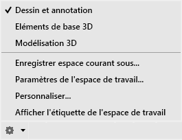 Dans les produits exécutés sous le système d'exploitation Windows, l'espace de travail est composé de groupes de fonctions et d'onglets sur le ruban, de menus, de barres d'outils et de palettes qui vous offrent un environnement de dessin multitâches personnalisé. Vous pouvez passer à un autre ruban en changeant d'espace de travail. Dans la barre d'état, cliquez sur Passage d'un espace de travail à un autre et sélectionnez l'espace de travail que vous souhaitez utiliser. Par exemple, voici les espaces de travail initialement disponibles dans AutoCAD.
