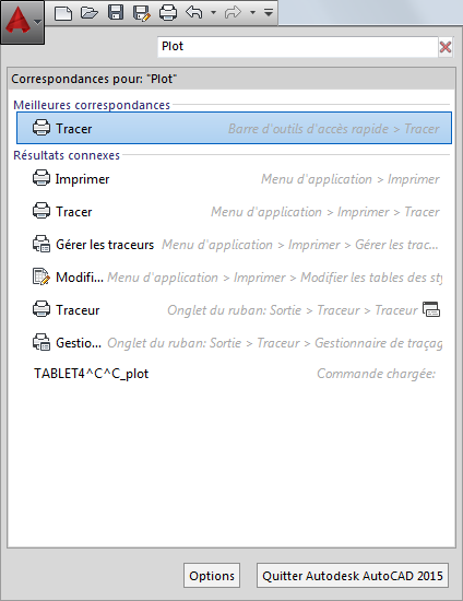Le champ de recherche de commande s'affiche en haut du menu de l'application. Les résultats de la recherche peuvent inclure des commandes de menu, des info-bulles de base et des chaînes de texte d'invite de commande. Vous pouvez entrer un terme à rechercher dans n'importe quelle langue. Les résultats s'appliquent à l'espace de travail courant.
