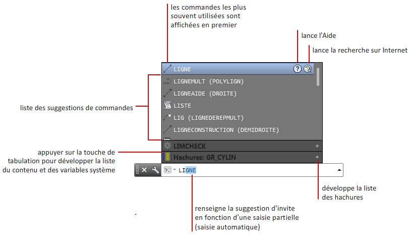 Une liste des commandes suggérées s'affiche dès que vous entrez les premières lettres d'une commande dans la fenêtre de commande ou dans la zone de saisie dynamique. Par défaut, la liste présente les caractéristiques suivantes :