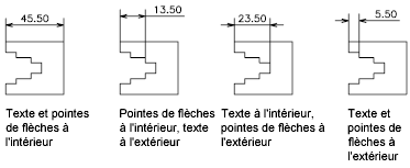 Si l'espace disponible est suffisant, le texte de cote et les pointes de flèche sont généralement placés entre les lignes d'attache. Vous pouvez définir le placement de ces éléments lorsque l'espace est insuffisant.