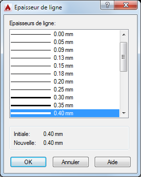 Affiche les valeurs d'épaisseur de ligne disponibles.