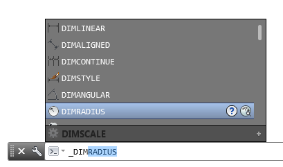 Dès que vous commencez à taper le nom de la variable système ou commande dans la ligne de commande, la fonction de saisie automatique affiche vos choix. Par exemple, si vous entrez dim, toutes les commandes et variables système commençant par ces lettres sont répertoriées comme indiqué.