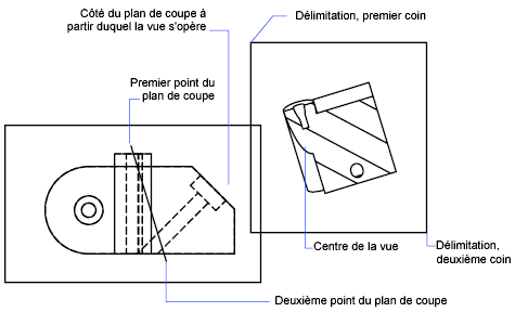 Crée une vue auxiliaire à partir d'une vue existante. Une vue est dite auxiliaire lorsqu'elle est projetée sur un plan perpendiculaire à l'une des vues orthogonales et sur un plan incliné dans une vue adjacente.