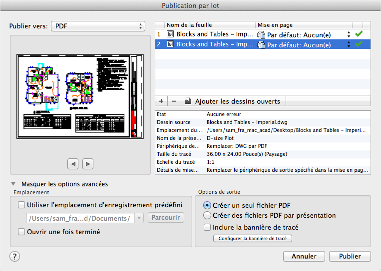 Vous pouvez publier le jeu de dessins dans un fichier PDF, ou l'envoyer vers l'imprimante spécifiée dans la mise en page pour en réaliser une copie papier.