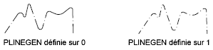 La variable système PLINEGEN gère l'affichage des motifs des types de ligne autour des sommets d'une polyligne 2D, ainsi que le lissage de ces sommets. Affecter la valeur 1 à PLINEGEN permet de générer de nouvelles polylignes dans un motif continu autour des sommets de la polyligne terminée. Affecter la valeur 0 à PLINEGEN permet de commencer et de terminer la polyligne par un tiret à chaque sommet. PLINEGEN ne s'applique pas aux polylignes à segments coniques.
