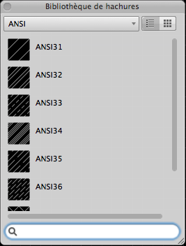 La bibliothèque de hachures peut être affichée sous forme de boîte de dialogue lors de l'utilisation de la boîte de dialogue Hachures et gradient, ou en tant que palette à partir du viseur Hachures ou Gradient.