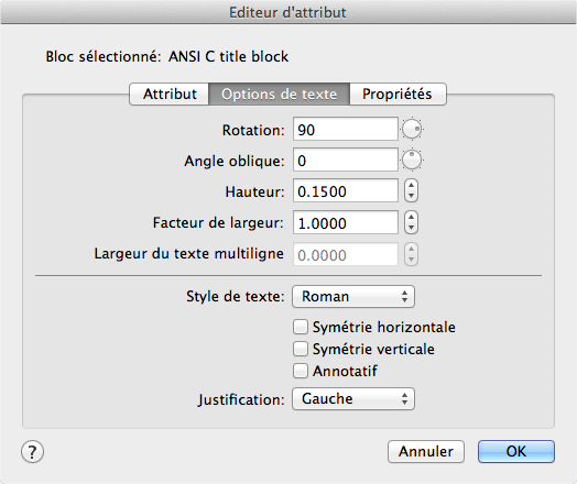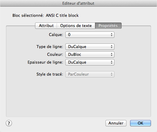 Définit les propriétés qui déterminent l'aspect du texte d'un attribut dans le dessin. Pour modifier la couleur du texte de l'attribut, utilisez l'onglet Propriétés.