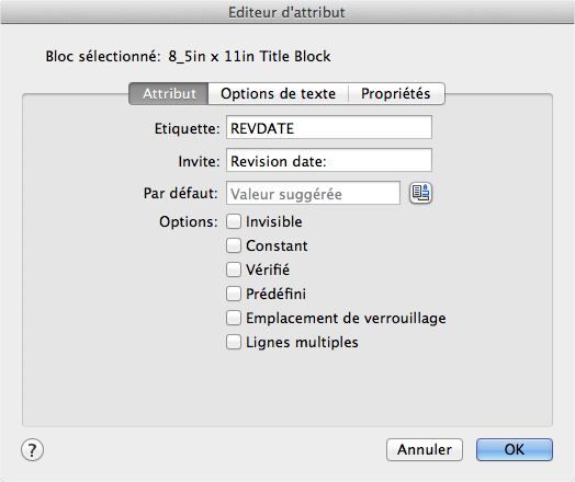 Verrouille la position de l'attribut dans la référence du bloc. Lorsqu'il est déverrouillé, l'attribut peut être déplacé par rapport au reste du bloc l'aide des poignées d'édition. Les attributs multilignes peuvent être redimensionnés.