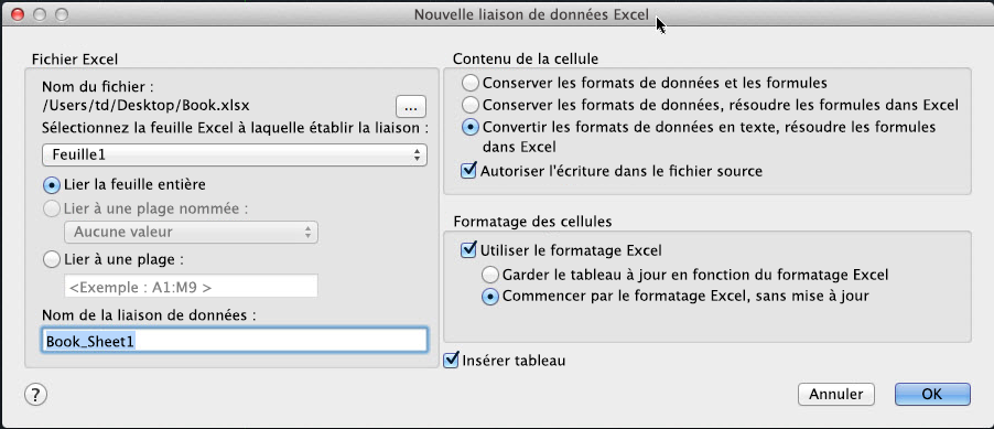 Importe le formatage spécifié dans le fichier XLS ou XLSX d'origine dans votre dessin. Cependant, aucune des modifications apportées au formatage n'est incluse lorsque la commande MAJLIAISONDONNEES est utilisée.