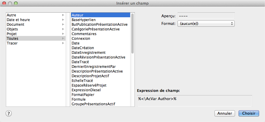 Le comportement des champs de projet (les champs sélectionnés dans la catégorie de projet) est différent de celui des autres types de champs. Par défaut, les autres types de champs sont automatiquement mis à jour lorsque vous enregistrez le dessin ou lorsque vous utilisez la commande REGEN. Au contraire, les champs de projet enregistrent les dernières valeurs utilisées et affichent ces valeurs si les informations référencées par le champ de projet ne sont pas accessibles. Pour mettre à jour la valeur d'un champ de projet, utilisez la commande METTREAJOURCHAMP.