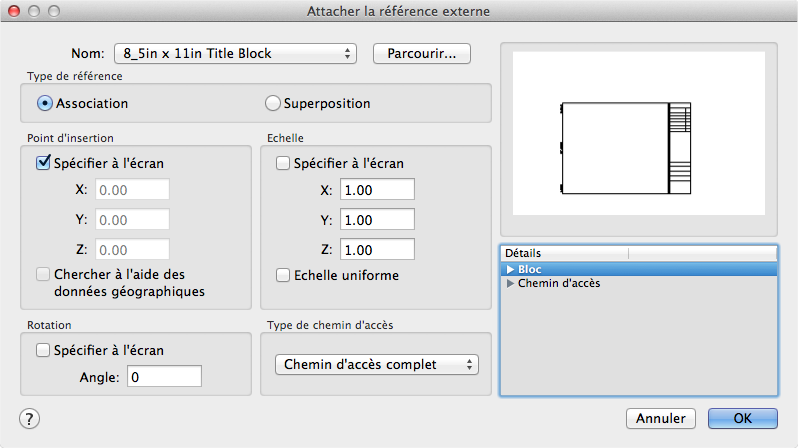 Spécifie si la référence externe constitue un attachement ou une superposition. Contrairement à une Xréf qui est une association, une superposition est ignorée lorsque le dessin auquel elle est attachée est à son tour attaché en tant que Xréf à un autre dessin.
