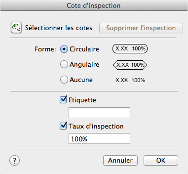 Contrôle la forme du cadre dessinée autour de l'étiquette, la valeur de cote et le taux d'inspection de la cote d'inspection.