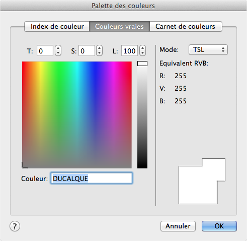 Spécifie le modèle de couleurs RVB pour la sélection des couleurs. Les options disponibles dans l'onglet Couleurs vraies dépendent du modèle de couleurs indiqué : TSL ou RVB.